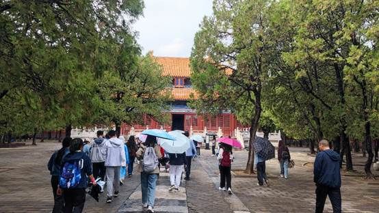 拨去细雨染湿的薄雾,同学们来到了参观考察的第二站定陵。定陵是明神宗朱翊钧及两位皇后的合葬墓,地面建筑占地18万平方米,总体布局为“前方后圆”,与中国古代哲学“天圆地方”观念相对应。作为我国按计划进行考古发掘的第一座帝陵,定陵地宫建筑深邃而神秘,出土的帝后衣冠、金银器皿等珍贵文物为明史研究提供了不可多得的实物资料。