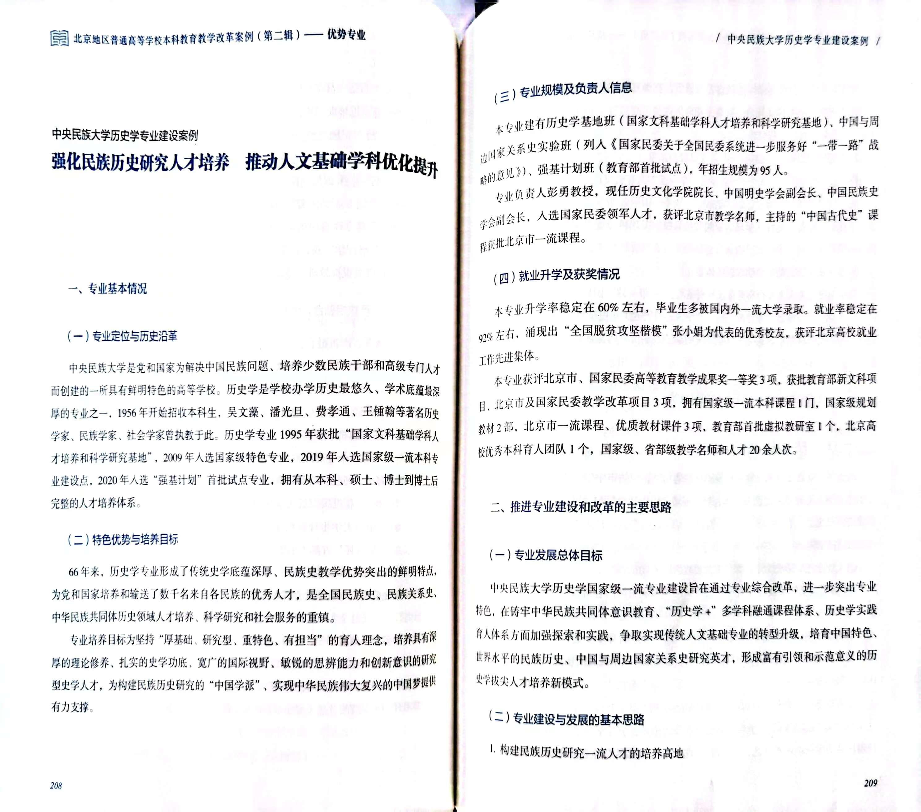 本次入选案例题为“强化民族历史研究人才培养,推动人文基础学科优化提升”,旨在通过专业综合改革,进一步突出专业特色,在铸牢中华民族共同体意识教育、“历史学+”多学科融通课程体系、历史学实践育人体系方面加强探索和实践,争取实现传统人文基础专业的转型升级,培育中国特色、世界水平的民族历史、中国与周边国家关系史研究英才,形成富有引领和示范意义的历史学拔尖人才培养新模式。
