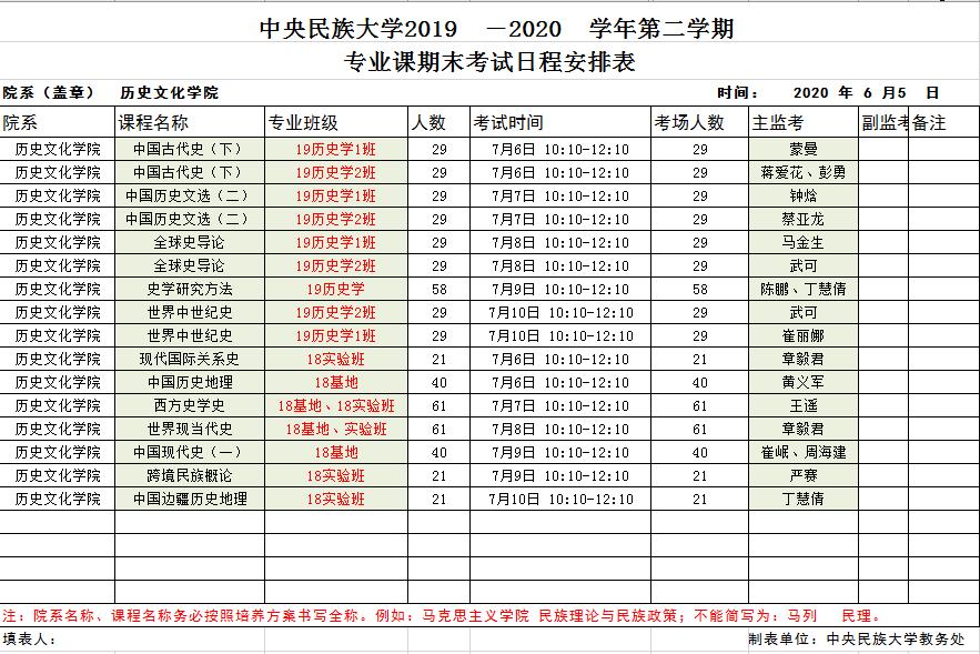 2019-2020-2学期期末考试安排如下图所示。由于疫情原因,本学期大部分考试均采取论文或开卷形式进行考核,故具体考试时间按照各任课老师要求进行,不要求严格按照此表进行考试。