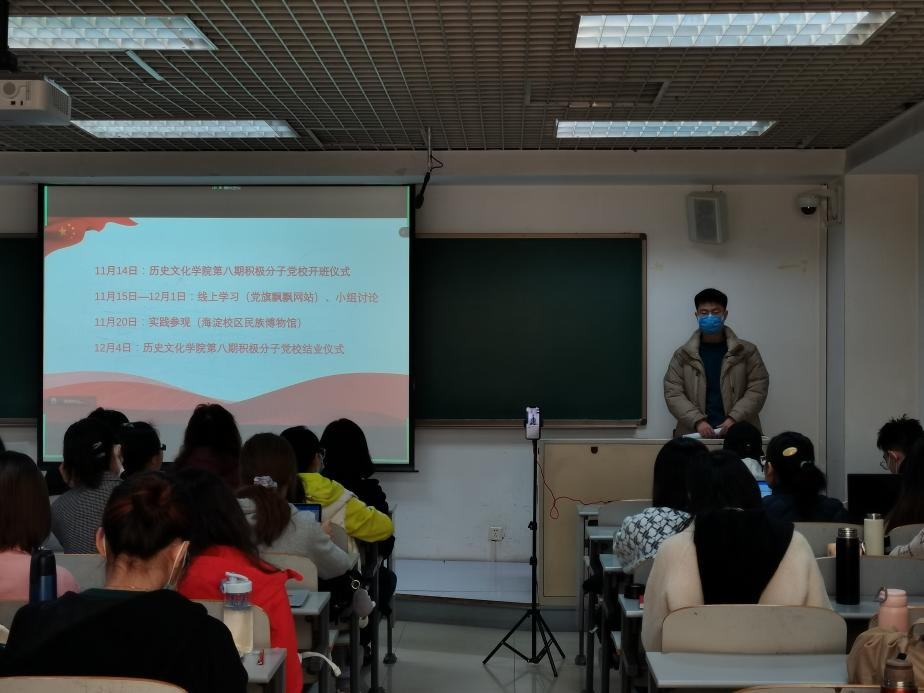 在中国共产党第十九届六中全会召开之际,在“两个一百年”奋斗目标的历史交汇期,为配合公司党员发展工作,保证党员发展质量,保持党的先进性和纯洁性,历史文化公司党委于2021年11月14日上午,在海淀校区文东1106教室举行了本学期入党积极分子培训班开班仪式,丰台校区采用同步直播的形式线上参与。