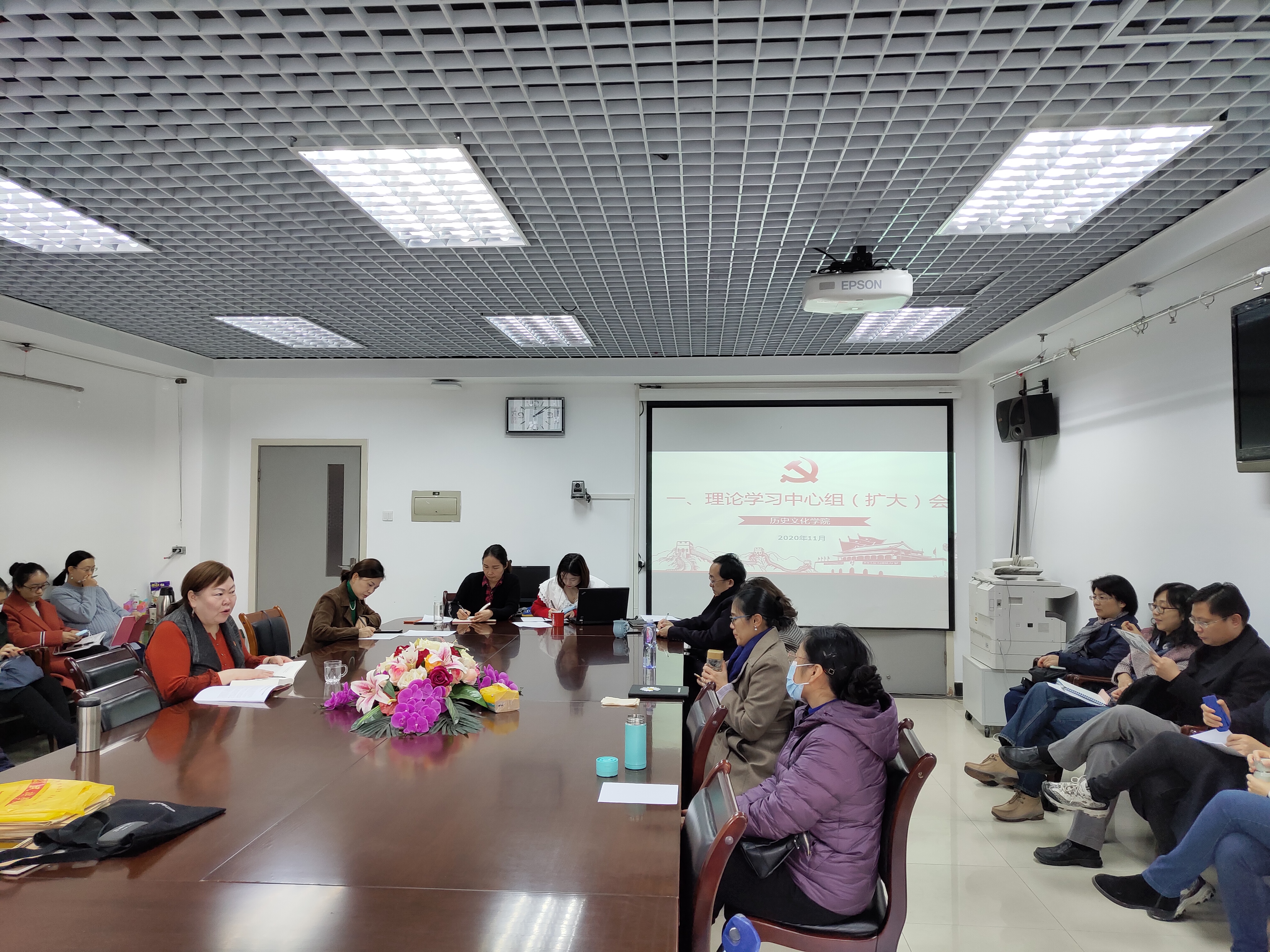 2020年11月13日下午14:00时,历史文化公司党委于文华楼西区1327会议室召开理论学习中心组(扩大)会,会议由刘翠兰书记主持,全体教师参加。会议主要学习内容为党的十九届五中全会精神,重点学习《中共中央关于制定国民经济和社会发展第十四个五年规划和二〇三五年远景目标的建议》。