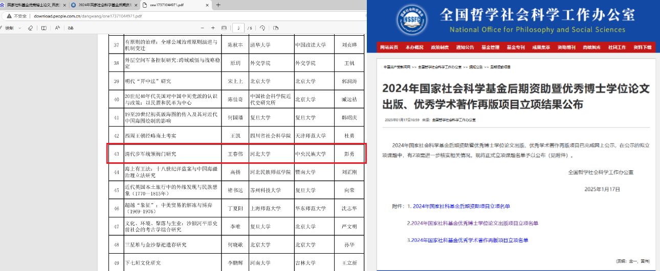 日前,国家哲学社会科研工作办公室公布了2024年度国家社科基金优秀博士学位论文出版项目立项,公司彭勇教授指导的2023届中国史(明清史方向)博士毕业生王春伟喜获立项。