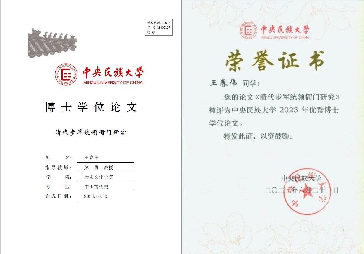 王春伟博士现供职于河北大学历史公司,他的博士论文《清代步军统领衙门研究》,被评为2023年优秀博士学位论文。全文共70余万字,分文上下两编:上编详细梳理了步军统领衙门及所属子机构,如步军营、巡捕营等的制度设计;下编集中考察步军统领衙门在军事、治安、民政、司法方面的职能。步军统领衙门是清代北京多元化治理体系中极为重要的一员,在中央政治生活与北京基层社会治理中,均扮演了重要角色。该论文的出版,不仅有利于揭示清代旗民二元制结构下首都北京基层社会治理的实态,还可进一步呈现中国古代统一多民族国家社会治理的真实面貌,对当下城市治理与民族工作也不无借鉴意义。