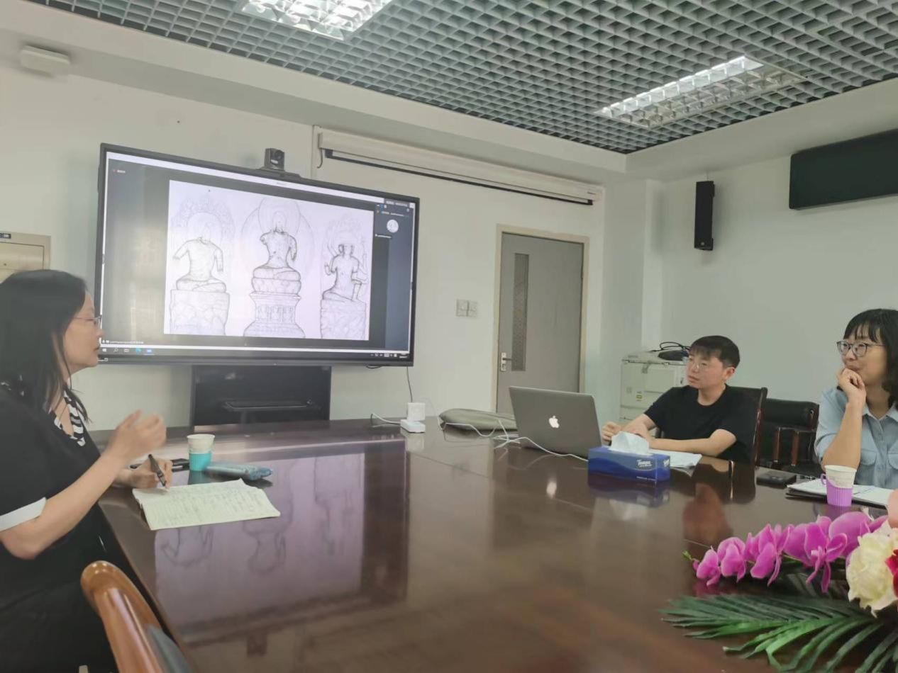 讲座伊始,丁慧倩老师介绍了杨晓东老师的研究领域。杨老师致力于佛教史、佛教美术史以及东北亚美术史,同时涉猎南亚、东南亚等亚洲地区美术史,曾在国际著名汉学杂志T'oung Pao(《通报》)发表文章。这次讲座杨老师主要是从佛教史与美术史的角度,围绕四川省邛崃市磐陀寺5号龛一铺摩崖造像的主题、年代和教相义理展开:从“智拳印”“迦楼罗炎”“左定执戟鞘”等细节入手,可知龛内镌刻善无畏传尊胜曼荼罗略本;从人物体态及慧琳《记〈佛顶尊胜陀罗尼经〉翻译年代先后》等线索入手,可知年代上限开元十年(722),下限不过中唐;造像如《尊胜佛顶修瑜伽法轨仪》所述,涉及瑜伽修持。已知唐代善无畏传尊胜曼荼罗略本仅此一铺,属密教“自观其身如大日如来等种种瑜伽之法”的早期孑遗。