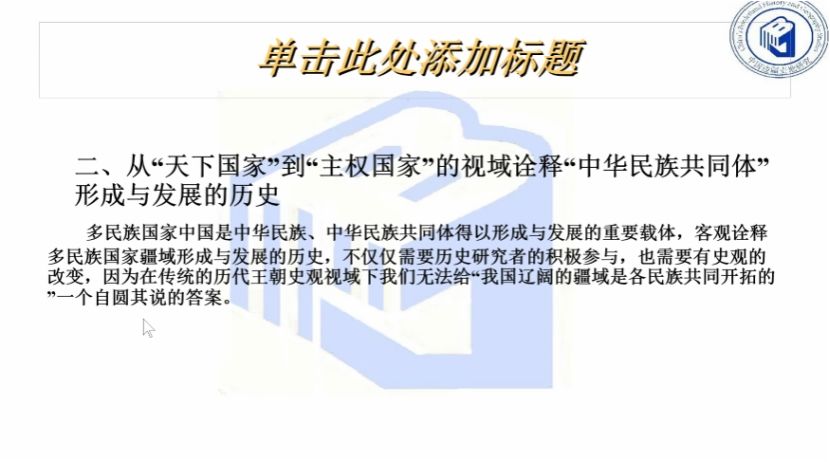 李大龙研究员讲授道,我们要铸牢中华民族共同体意识,客观诠释多民族国家、中华民族形成与发展的历史。“中国”并非专指王朝的疆域,其适用的场景是中华大地上众多的政权对“正统”乃至“大一统”的博弈,将其引入“历代国土范围”“历史上的中国”的讨论,和其性质并非完全吻合,不仅无助于讨论的深入反而极容易将讨论引入到“以谁代表中国”的误区,历代王朝和非历代王朝都是多民族国家中国历史的组成部分,是共同缔造,不存在谁加入谁的问题。李老师以水系比喻,为我们讲述了历代王朝(中国)是干流(黄河),边疆(非中国)是支流(非黄河),同属“中国(多民族国家)”(黄河水系)。全面书写才能完整客观。《中华民族共同体概论》的处理方式,主要体现在几个方面:一是以整体的视角,用中华文明统领整个叙述。二是虽然以历代王初存在的时间作为划分每讲的时段,但具体叙述则超越了历代王朝的涵盖范围。三是设置前序和小节,用意也在超越历代王朝。