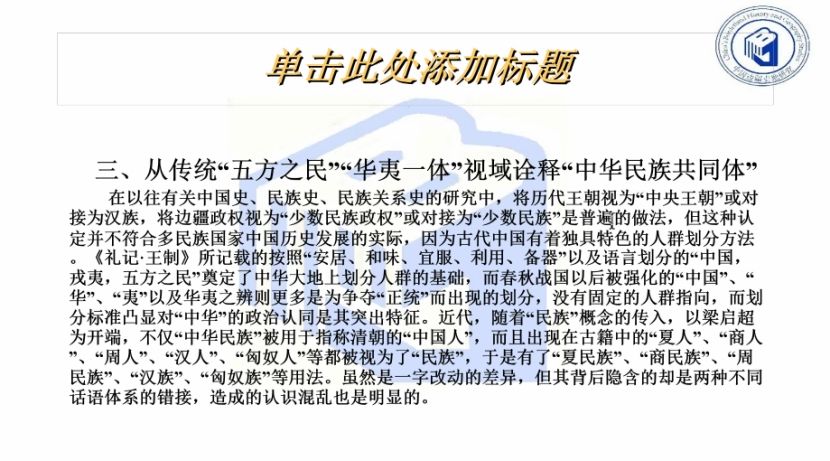 在对“族类”和近代以来传入的“民族(nation)”两种概念加以区分和阐释以后,李大龙研究员指出,从中华大地上人群划分的传统看,中华民族、中华民族共同体是生息繁衍在中华大地上的众多人群在构建多民族国家中国的过程中凝聚而成的命运共同体,无论是“中华民族”还是“中华民族共同体”,都是一个客观存在的共同体,并不存在“建构”的问题。客观完善的诠释中华民族、中华民族共同体的历史,需要观念的改变,不仅要分清楚两种不同话语体系差异,更要在“五方之民”“华夷一体”等传统观念视角下认识和诠释中华民族、中华民族共同体的形成与发展。李老师与我们分享,如何处理历史上的人群称呼,并不是单纯的概念使用问题,“人”和“族”虽然是一字之差,却是两种不同认识,分属于东西方两种不同话语体系,将“人”改为“族”不仅容易对史书的记载出现误读,在西方“民族”语境下也难以理解中华民族交流交往交融的历史过程。