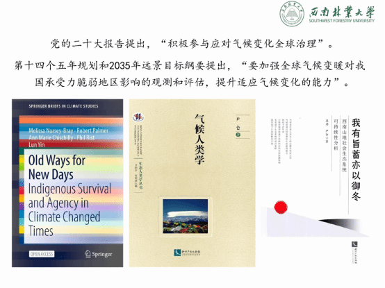 关于我们应该采取怎样的行动,尹老师对党的二十大报告提出的“积极参与应对气候变化全球治理”和第十四个五年规划和2035年远景目标纲要提出:“要加强全球气候变暖对我国承受力脆弱地区影响的观测和评估,提升适应气候变化的能力”进行了阐述,并总结道:“民族传统知识蕴含着保护生物多样性和应对气候变化的智慧光芒”。