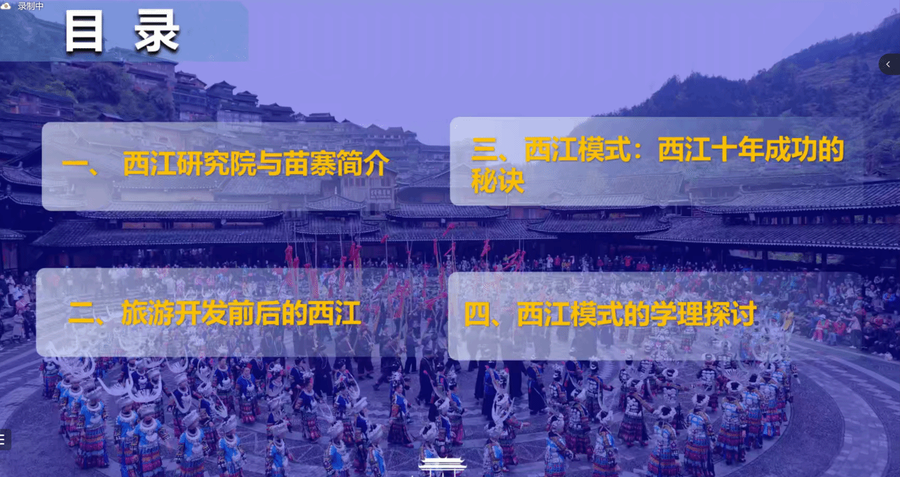 本次讲座主要分为四个大部分:西江研究院与苗寨简介;旅游开发前后的西江;西江模式——西江十年成功的秘诀;西江模式的学理探讨。