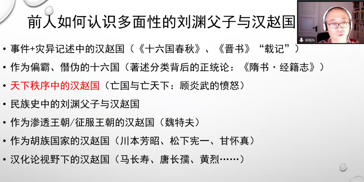 在以上三方面分析的基础上,侯旭东教授又将讨论引向了更为宏大的问题:如何理解中国古代史上少数民族入主中原建立政权这一现象。侯教授将刘渊视为中国历史上于中原建立少数民族争取的“第一人”,认为汉赵国与此后的辽、金、元、清等少数民族所建政权具有相当程度的共通性。由于年代较早,汉赵政权呈现着颇多复杂的色彩,南匈奴君主对汉制的理解也存在偏差,因此对于汉赵国的相关研究分析具有一定的困难。但侯教授还是希望通过这个少数民族所建立政权的“起始”,对整个中国历史上的少数民族政权性质作新的思考,对传统胡汉分立、胡汉交融、胡化汉化等问题的解释路径,以及西方“渗透王朝论”、“征服王朝论”、日本“胡族国家论”的观点进行反思。