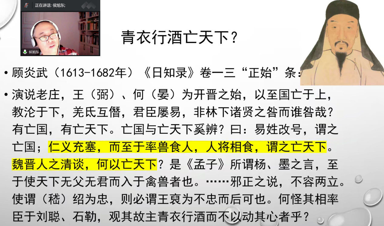 第三部分是对“单于无北顾之怀,猃狁有南郊之祭”这一“矛盾”的具体解释。在该部分的讲述中,侯教授基于“青衣行酒”的历史背景,从刘渊父子的个人原因和较为深层的历史动因两个方面展开了详细阐述。他还对顾炎武就“青衣行酒亡天下”的相关看法及这些观点的时代局限性进行了分析,指出了“青衣行酒”只是颠倒了天下秩序,而并未彻底打破旧有的秩序格局。刘渊、刘聪所建立的汉赵政权,绝不是“另一种国家建设的模式”,其本质仍是模仿中原王朝来营造传统的“天下秩序”,“表面颠覆的背后是旧有机制的重建”。