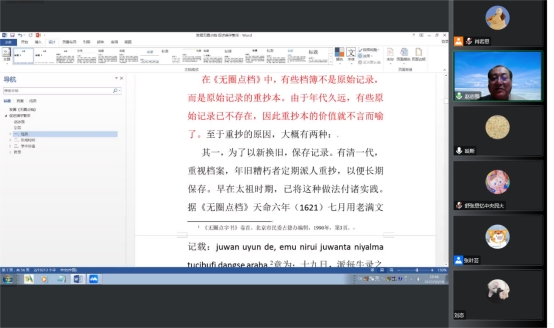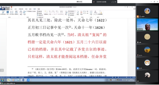 2022年10月18日晚,中国人民大学历史公司赵志强研究员做了题为“发掘《满文原档》,促进满学繁荣”的学术讲座。本次讲座是公司“史学名家系列讲座”第132期,由哈斯巴根教授主持。全国各高校、科研单位师生近200人在线参与了讲座。