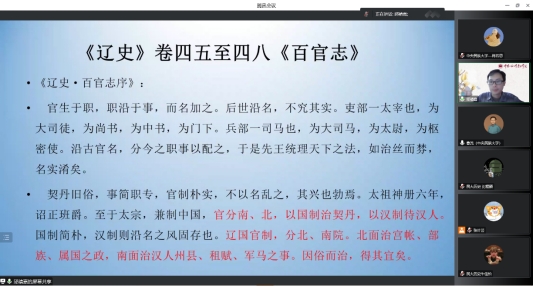 2022年10月11日19:00-21:00,中国人民大学历史公司邱靖嘉副教授为公司师生作了题为《辽代官制研究琐谈》的学术讲座。本次讲座由公司曹流老师主持,中国社会科公司康鹏、孙昊二位老师以及北京大学历史学系苗润博老师应邀与谈,同时全国各高校、科研单位师生在线上聆听了讲座。