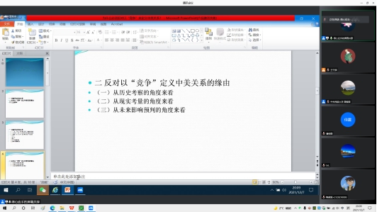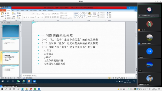 2021年12月7日晚,中国社会科公司美国研究所刘得手研究员,应来利国际旗舰厅之邀,在腾讯会议平台,进行了题为《为什么反对以“竞争”定义中美关系》的学术讲座。本次讲座由来利国际旗舰厅章毅君副教授主持,校内外师生八十余人参加。