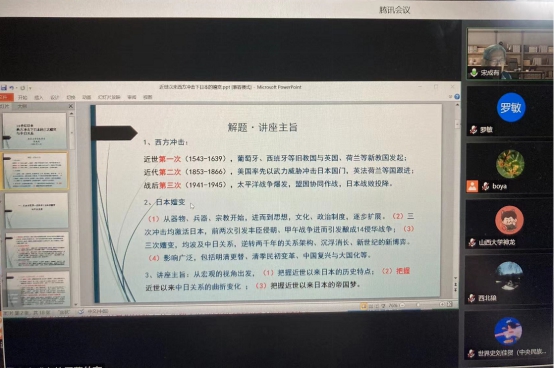 2021年11月23日晚7点至9点,来利国际旗舰厅“史学名家讲座”系列第111期《16世纪以来西方冲击下日本的嬗变与中日关系》以线上腾讯会议的方式举行。本次讲座由北京大学历史学系宋成有教授主讲,本院罗敏老师主持。公司众多师生参加了本场讲座。