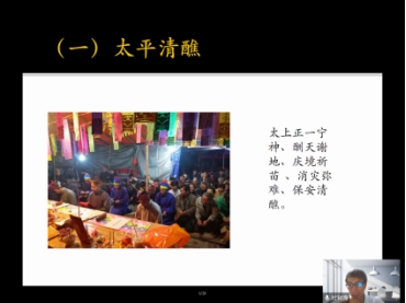 第二部分,不同仪式专家与仪式传统间的权利关系构成一统。当地仪式传统主要为太平清醮。太平清醮是当地酬谢天地、祈福消灾的集体仪式,由道公主持,麽公麽婆辅助。杜老师分析了仪式举行过程中体现了不同仪式专家间的权利关系,如时间节奏、空间位置以及法力授受均以道公为中心。法力授受为盖帽(授戒)仪式是麽公麽婆的成麽仪式,也由道公率领完成。杜老师指出,当地多层的仪式传统中仪式专家道公占有主导地位,并对其他传统形成统合之态,对此参与仪式的各方如道公、麽公、麽婆以及民间传说均保有共识。