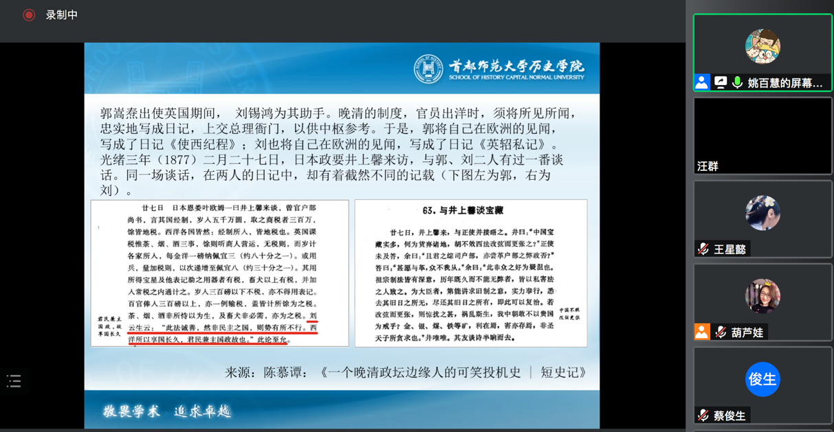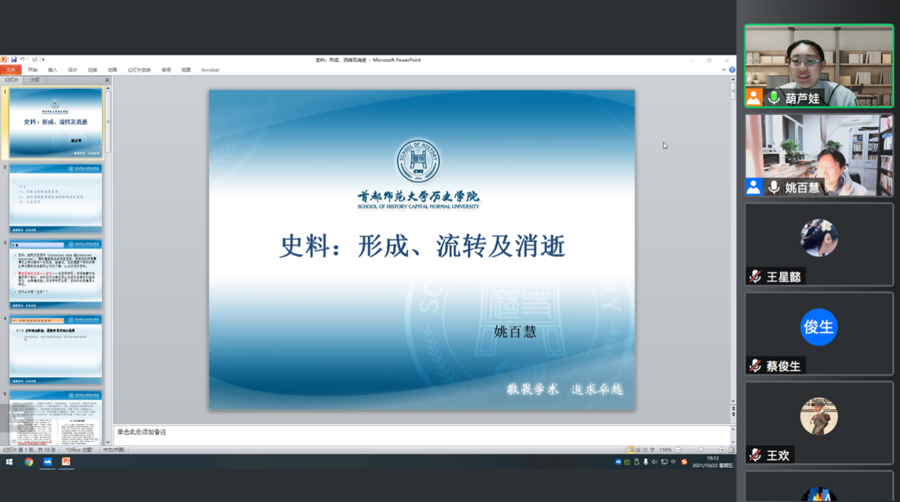 2021年10月22日19时至21时,首都师范大学历史公司副经理姚百慧教授应来利国际旗舰厅之邀,以腾讯会议的形式进行题为《史料:形成、流转及消逝》的学术讲座。来利国际旗舰厅胡晔老师主持本次讲座,本硕博各年级的同学积极参加了此次讲座。