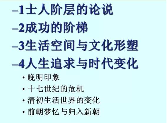 冯老师认为,研究历史需要看到“人”。由于朝代越到晚期资料越丰富,可供讨论的话题和依据也会更多。因此将眼光聚焦到明清易代之际知识分子的社会表象和日常生活,通过数量繁多和种类丰富的史料阅读可以发现这一时期士人在生活和文化上存在的断裂和延续的问题十分复杂而且意涵丰富,并由此引出讲座的主题。即后讲座从“士人阶层的论说”“成功的阶梯”“生活空间与文化塑形”“人生追求与时代变化”四个方面展开。
